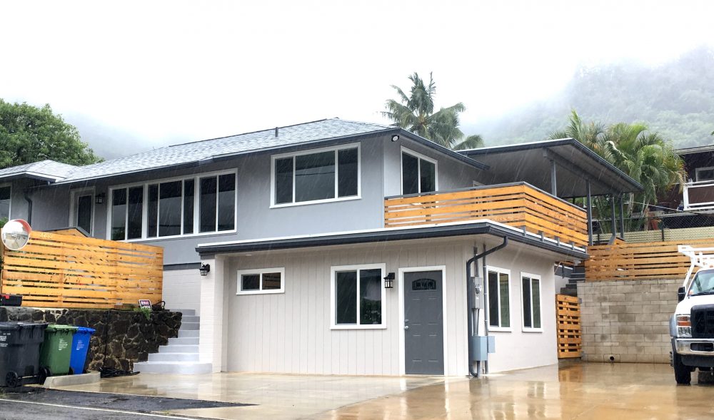 This renovation opened up the property to more light and airflow and added more usable space. Instead of the planned Accessory Dwelling Unit (ADU) to replace the yard (the sewer capacity would not allow an ADU), the Kalihi Valley homeowner converted the existing garage into a rec room. We also enclosed the patio, remodeled the kitchen, and added an interior laundry.