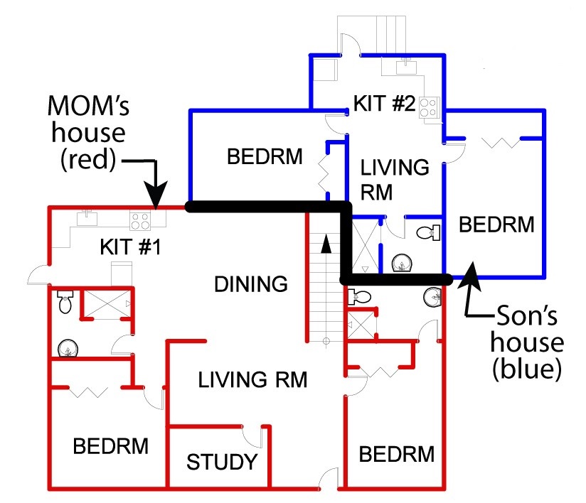 This floor plan was created for a homeowner who wanted to provide more privacy and independence for her son. He pays less rent than if he lived elsewhere and can come and go as he pleases without disturbing the rest of the household.